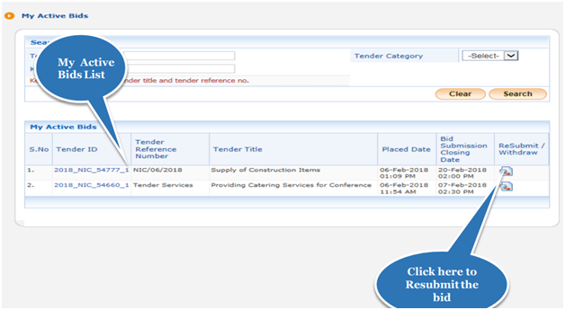 In this section we will guide you the process of Resubmission, in other words to modify your already submitted bid ie: change of your any submitted document or Rate in your bid against any tender.