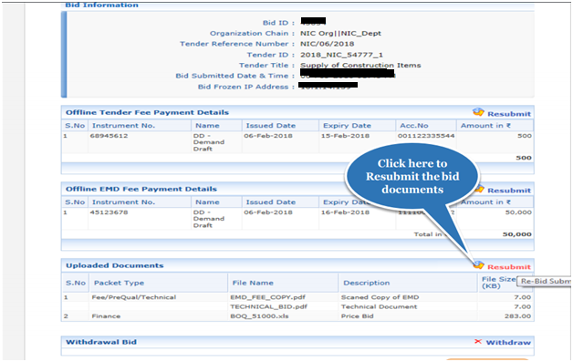 Now on the next page you will find the Resubmit link against each section, this means you will find option to click on resubmit link against Fee, Emd and Uploaded document (covers). You can click on the resubmit link for the section which you are willing to modify or change. The other details will remain save and you do not need to do the whole submission process again but only that particular section will be changed which you are willing to.