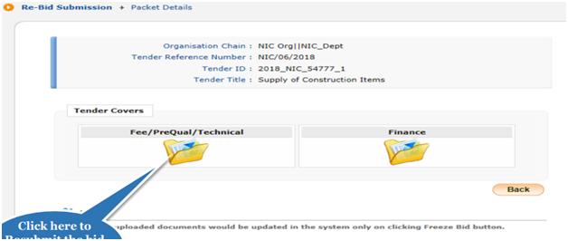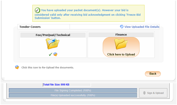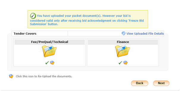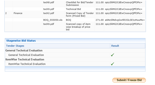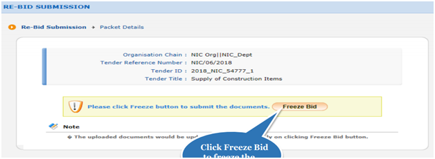 If all documents are uploaded but Freeze Bid button is not clicked then your bid will not be considered submitted and will not appear at the time of Tender Opening.