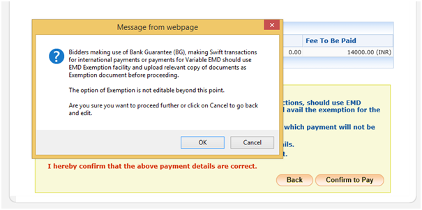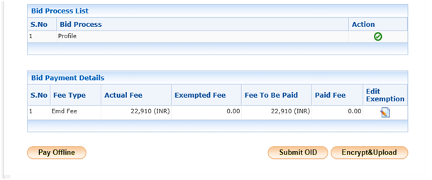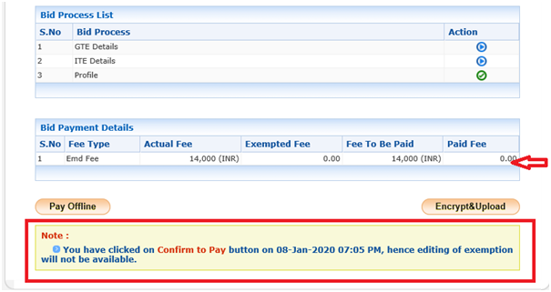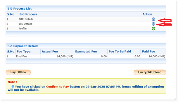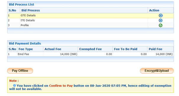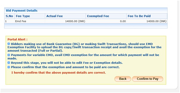 Once Ok button is finally clicked then portal show below screen and there is not option to edit the exemption details any more. Now bidder has to proceed with selected option.