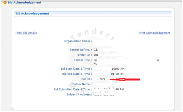 Make sure a proper Bid Acknowledgement is generated by the portal and a Bid Id is given to you. In case this acknowledgment is not generated then portal will show you some error. Make sure that error is rectified then freeze the bid again. It is always advisable to keep the print out of this page because it is a one time option and will not appear again.