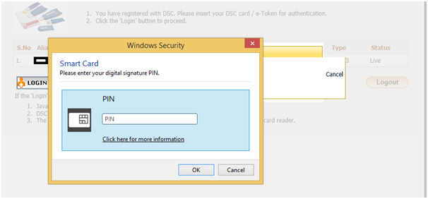 Select your File and click on Sign link given next to browse link then enter your DSC PIN.