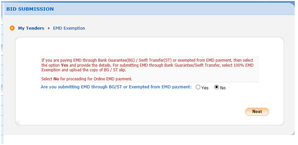 1: Payment mode is online: In case of payment mode is online but dept have mentioned the payment to be done by BG/DD/ST or any other offline mode then bidder should select yes for this option then on next page upload scan copy of BG/DD/ST etc and fill the respective amount for which the payment instrument is being uploaded.