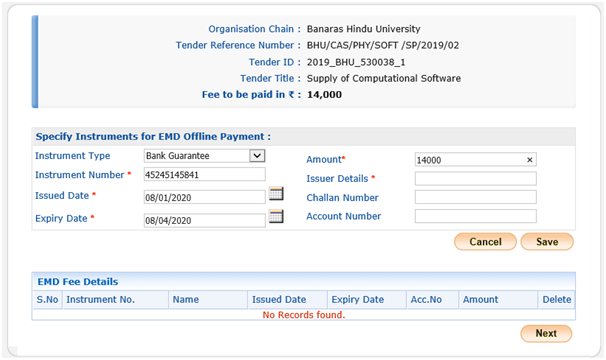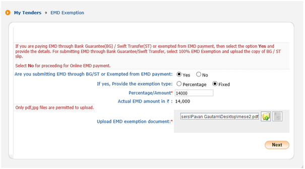 2: Payment mode is online and you fall under Exemption criterial: If payment mode is online and dept have mentioned the exemption eligibility details in tender document then upload the respective Certificate (eg: NSIC, MSME etc) in in this section and full the amount which you are not going to pay.