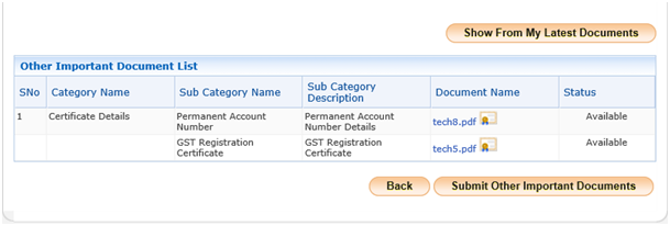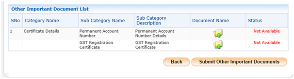 Follow the same process for all documents which show Not Available. Once it shows Available againt all documents Then Click on Submit Other Important Documents Button.